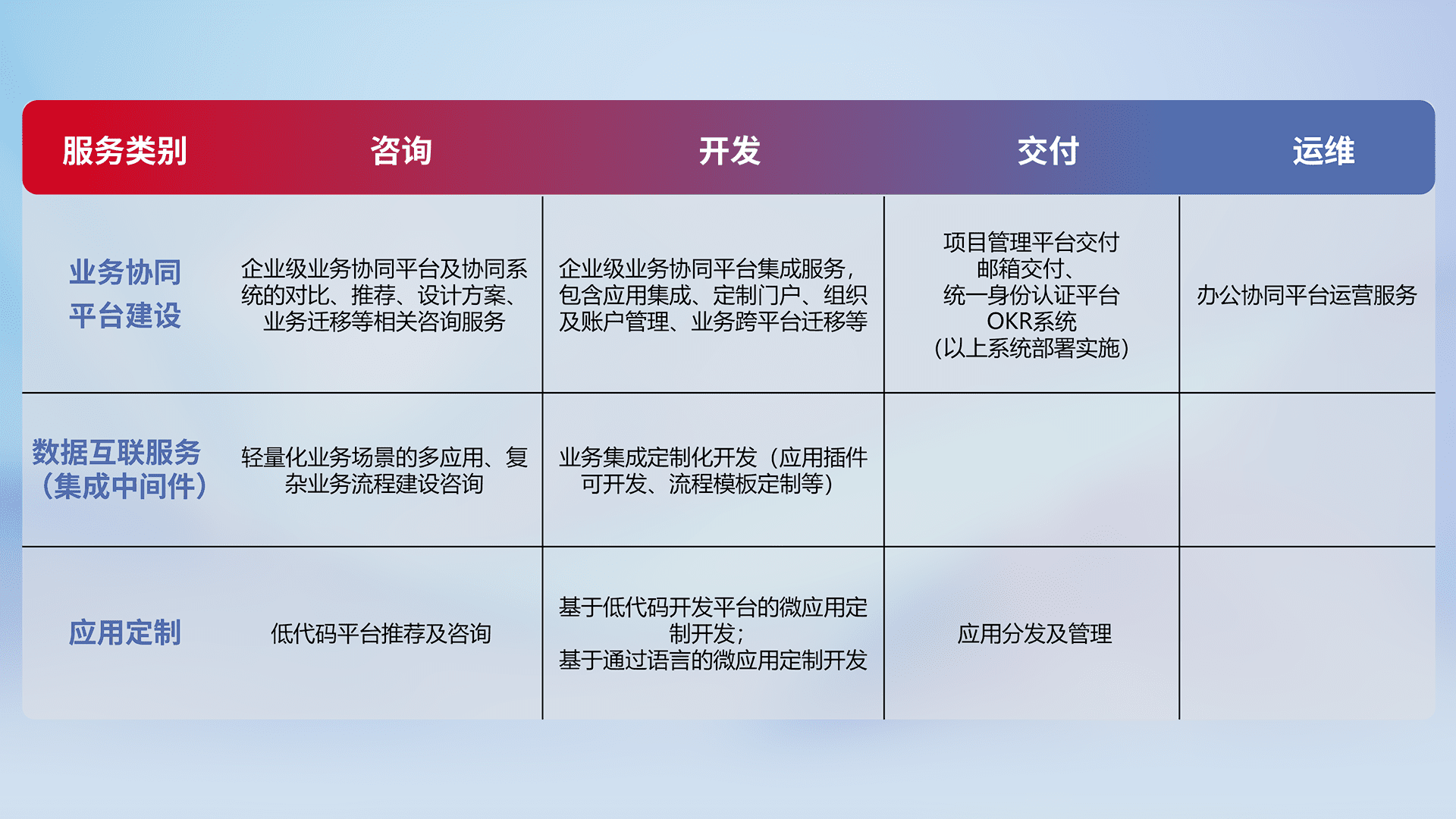 针对钉钉、、企微、、IDaas等平台级产品提供产品的规划、、、、方案、、、交付、、定制化开发等服务,,,实现如统一协同办公、、、、智能客户服务、、混合会议管理、、、、智能数据查询、、等业务场景,,,实现数字化转型。。。